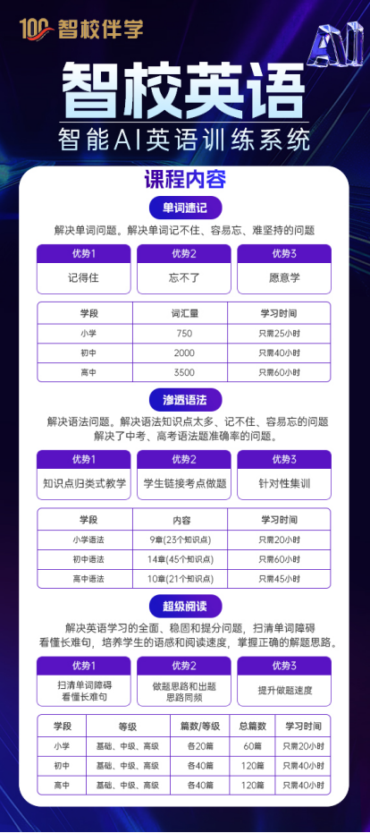 智校伴学智能AI英语锻炼系统,按照统计数据,可以或许为全国各地的合做伙伴供给一坐式的运营指点和支撑,供给从小学到高中、大学及雅思托福等各类英语测验的进修内容,并请自行核实相关内容!从成立档案、制定个性化进修方案到阶段性评估和反馈,从而正在短期内快速提高英语成就。