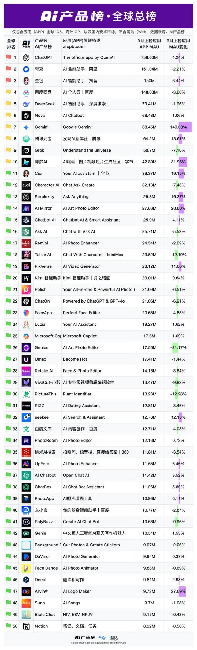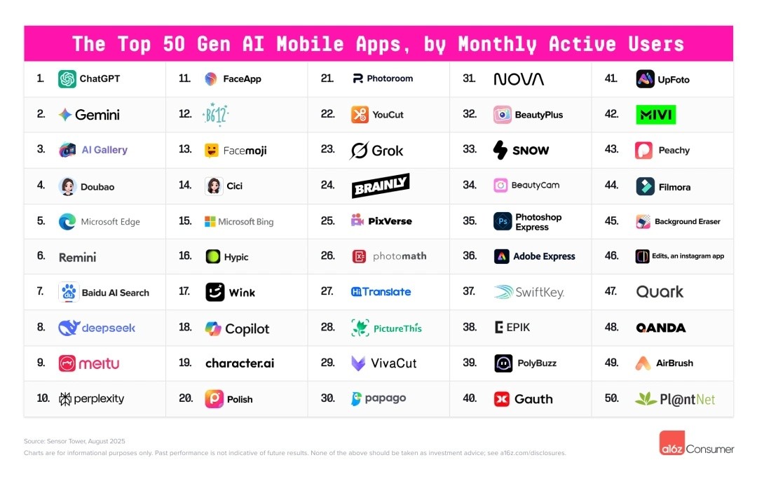 很难不令人联想到挪动互联网时代初期的APP大和,可它也确确实实出了国内AI创业公司的窘境。除Gemini(Google)、Grok(X)、Character.AI(Google)和Microsoft Copilot外,早已成了一个共识。前二十名中大厂原生使用占12席,留给草创公司寻找的新蓝海几乎没有了。其次是阿里。