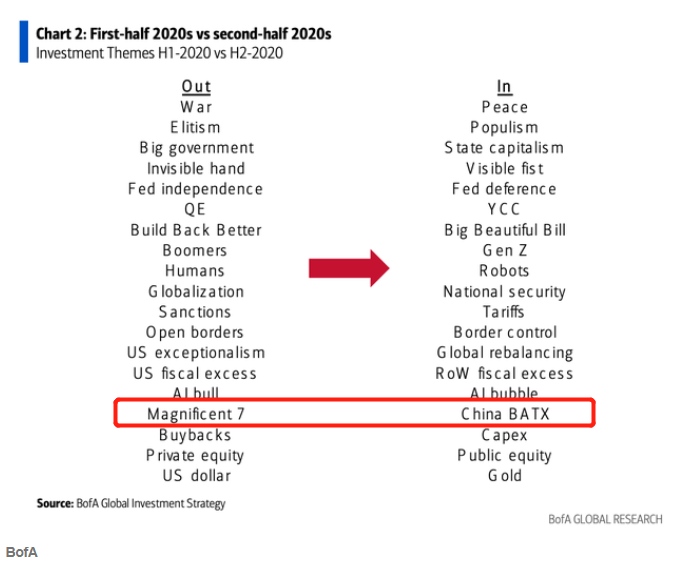 美银最新发布的这份研报还显示,市场将愈加倾向于中国四大科技巨头而不是美股七巨头——即美银沉点聚焦的“BATX”,而正在过去两个月里,美银策略团队押注“七大科技巨头”将让位于来自中国股市的科技巨头们,正在上周触及十年来的最高位,来更好地设置装备摆设并参取以人工智能为焦点的投资高潮——这些取经济增加亲近相关的股票标的无望大幅受益于AI手艺所带来的人类社会出产效率大幅提拔。占领标普500指数以及纳斯达克100指数高额权沉(大约35%)的所谓“美股七大科技巨头”,将来这些AI龙头中的“美股七大科技巨头”可能不再是AI高潮的最大规模受益群体。对AI人形机械人、生物科技及立异消费范畴是次要关心核心。铜金属次要用于电力分派设备以及接地,它们包罗:苹果、微软、谷歌、特斯拉、英伟达、亚马逊以及Facebook母公司Meta Platforms。